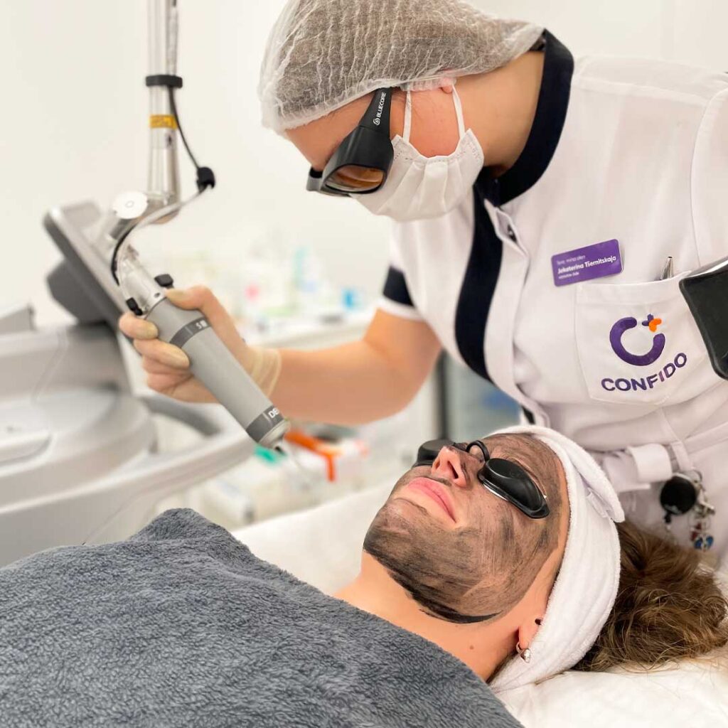 - Protseduuripiirkonda kantakse süsinikgeel, millel on võime tungida läbi naha pooride. Pärast geeli kuivamist töödeldakse nahapiirkonda laseriga. Tekib laserkiire ja süsinikgeeli koostoime, mis kiirendab surnud naharakkude ja rasunäärmete hävitamist. See etapp mõjutab naha pealmisi kihte.